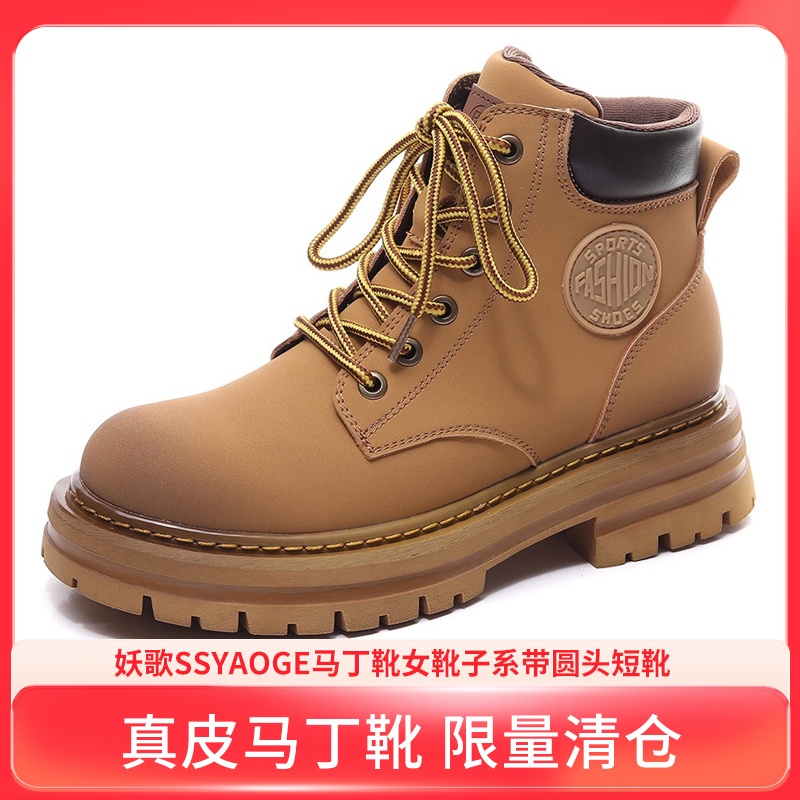 妖歌SSYAOGE头层真牛皮粗跟短靴软底英伦方头低跟靴子JM1528 黑色单里 35