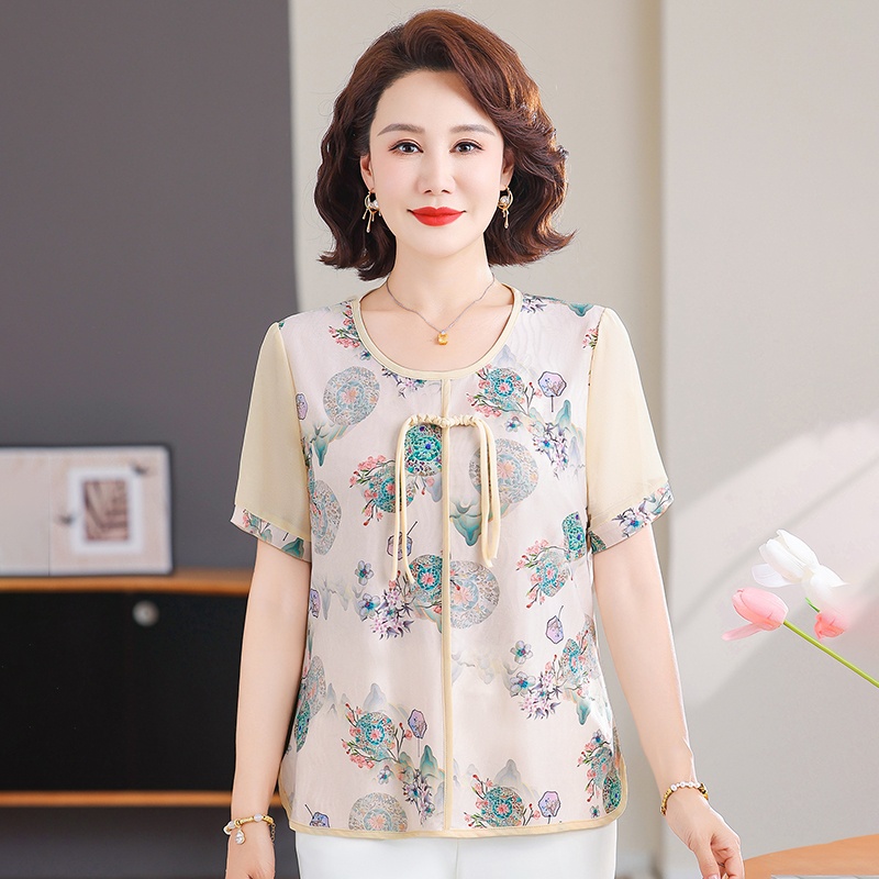 寻蔻年华连衣裙薄款中式短袖网纱休闲长裙98139 粉色 XL