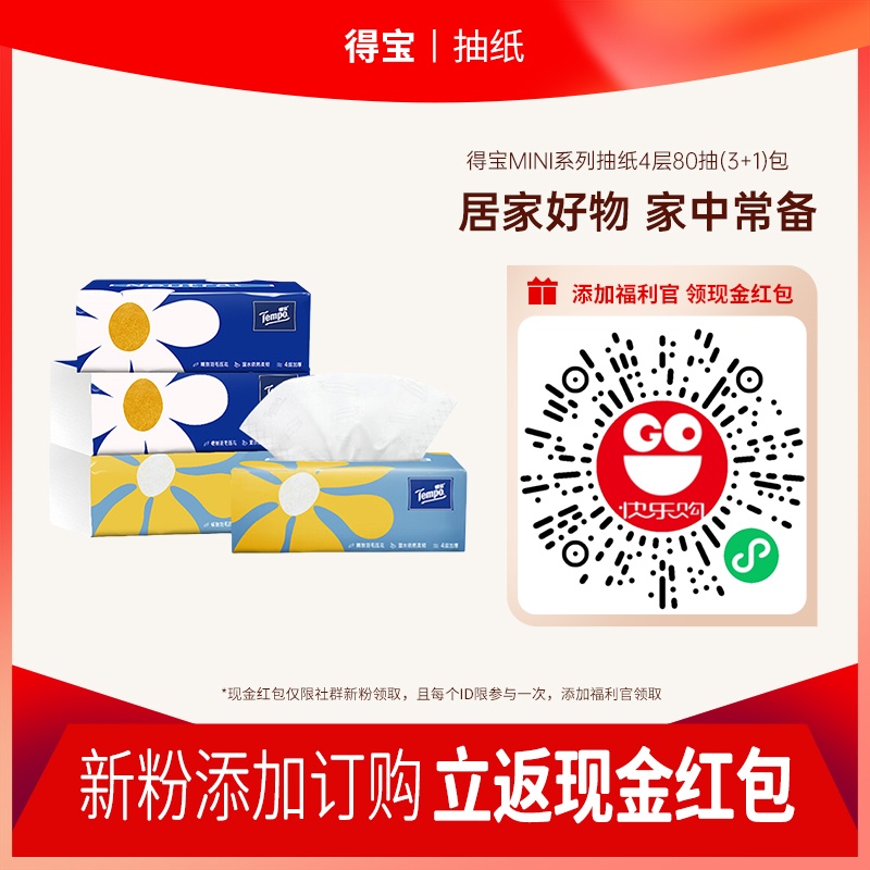 得宝Tempo自然无香抽纸面巾纸4层90抽8包装T2367