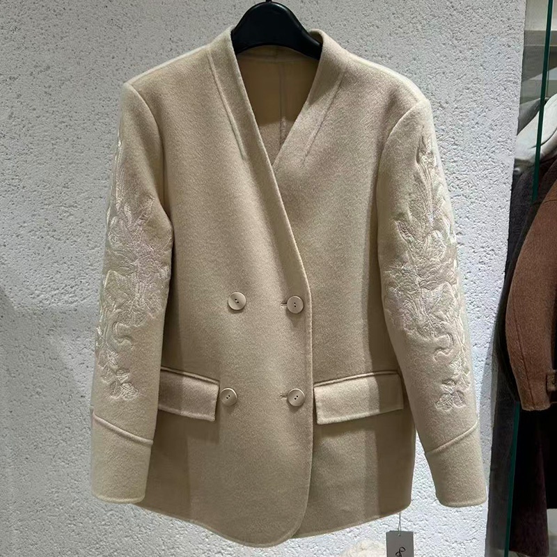 帕佳妮【10%山羊绒 90%绵羊毛】重工刺绣V领长款羊绒羊毛大衣85142 驼色 M