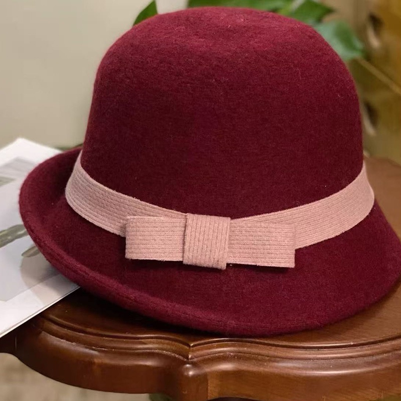 太阳城赫本风珍珠缎带羊毛定型礼帽 酒红色 均码