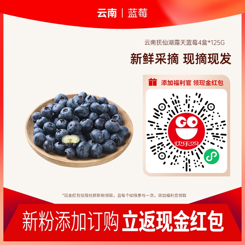 [新鲜采摘,现摘现发]【顺丰空运】云南抚仙湖露天 L25花香蓝莓4盒*125g/单果15mm+