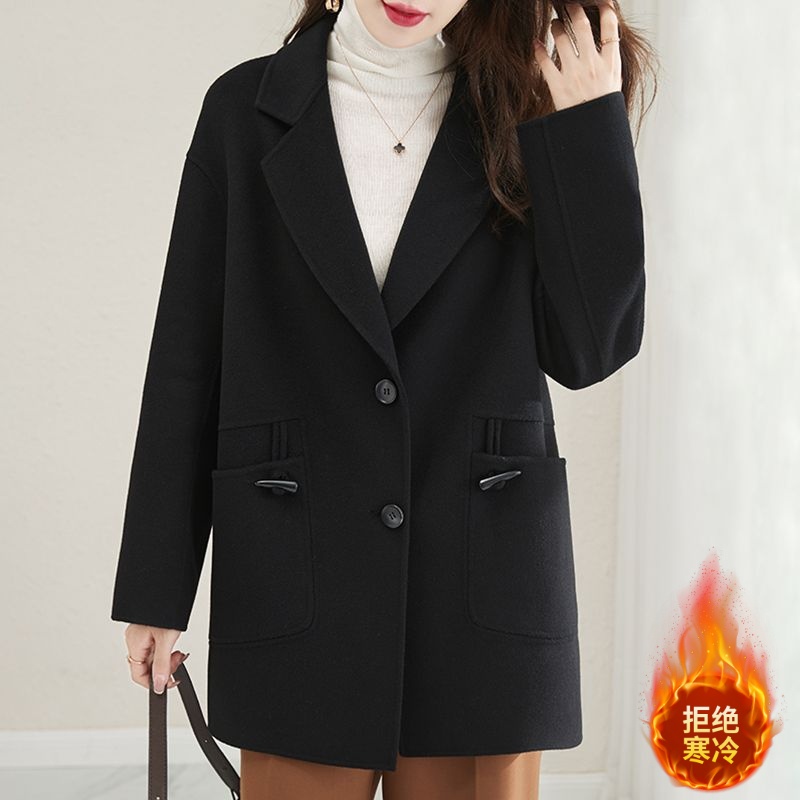 [光泽自然 亲肤舒适]柏黛莎秋冬时尚柏黛莎韩版宽松显瘦百搭气质纯色西装领加厚毛呢外套女 黑色 M