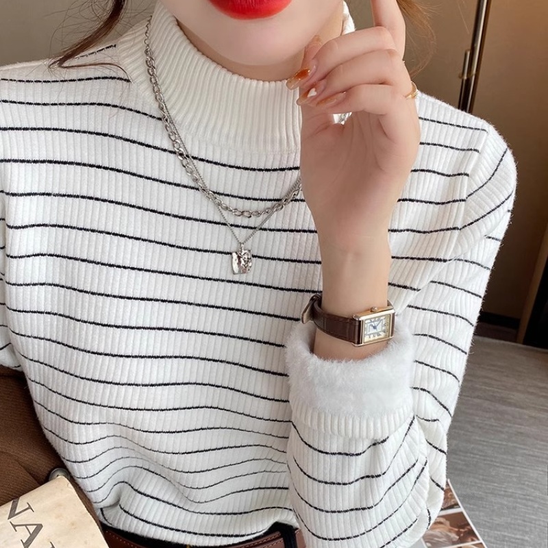 柏黛莎秋冬季新款蕾丝羽毛纱针织衫女季长袖打底衫内搭加厚衫5520 米杏色 M
