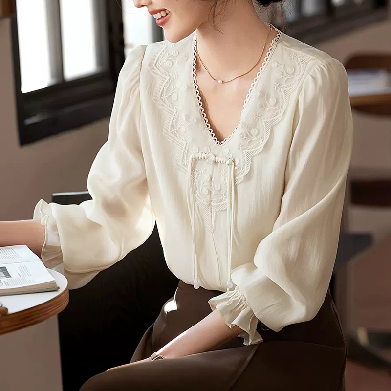柏黛莎新款立领蕾丝衫上衣显瘦长袖打底衫女5519 米杏色 M