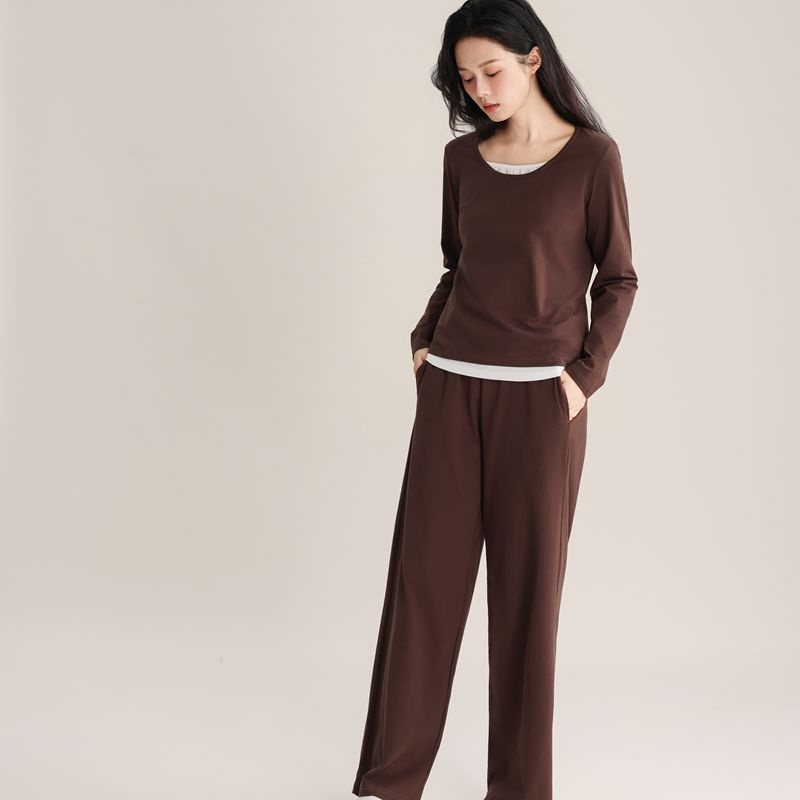 意丝涵春夏纯棉双层纱V领家居服套装女款560213 烟熏米 M