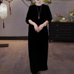 千奈莉新中式国风100%桑蚕丝丝绒秋冬连衣裙YJ277 黑色 L