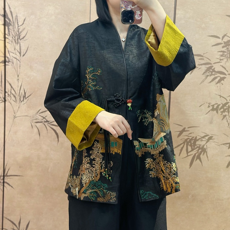 [非遗苏绣 古韵香纱]西湖名片非遗苏绣亭台楼阁100%桑蚕丝香云纱外套85038S 黑色 M