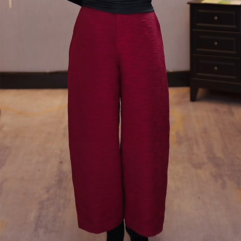 千奈莉锦油绸如意纹高腰显瘦调性香云纱花苞裤 红色 L