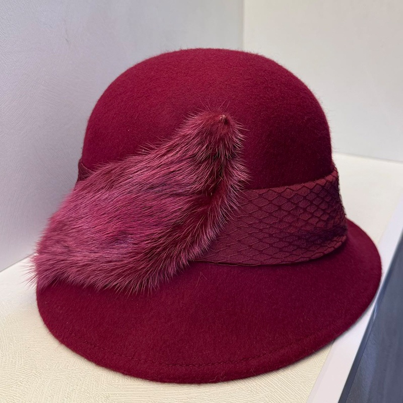 [翻新记忆 恣意时尚]太阳城专柜奢华水貂羊毛定型礼帽 酒红色 均码