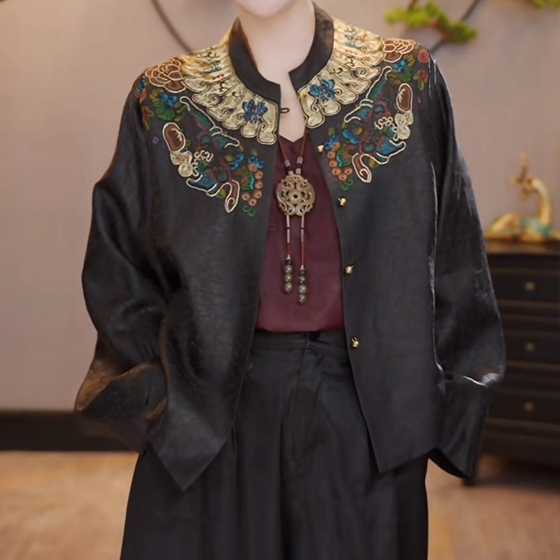 千奈莉老料绢缎双面调性香云纱外套YJ301 黑色 均码